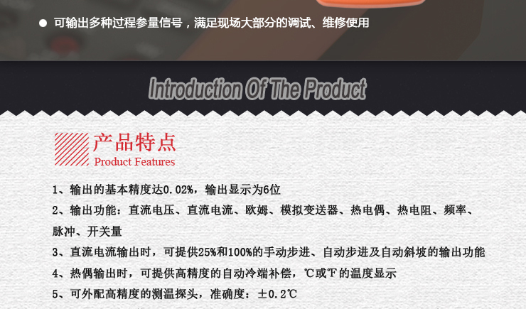 具有高精度輸出現(xiàn)場所需的各種過程參量,適用于現(xiàn)場溫度變送器、壓力變送器、DCS、PLC等系統(tǒng)的調(diào)試和校準,并在石油化工、生物制藥、工業(yè)自動化、大專院校和科研機構(gòu)等領(lǐng)域的得到了廣泛的應(yīng)用。