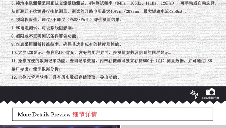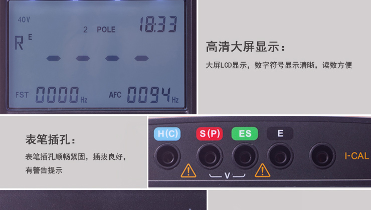 l 接地電阻測量采用正弦交流激勵測試,4種測試頻率(94Hz、105Hz、111Hz、128Hz),可手動或自動選擇,從而避開干擾源進行接地測量。測試的開路電壓最大40Vrms / 20 Vrms,最大短路電流<250mA 。