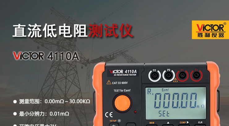 VICTOR 4110A 直流低電阻測試儀采用直流激勵4極法測量,適用于測量電纜的導線電阻,開關、接插件、繼電器的接觸電阻,線圈、電動機、變壓器繞組的電阻以及金屬鉚接電阻,金屬構件之間聯結電阻測試,低值電阻測試,地網地極間連接導體的電阻測試,接觸電阻測試。