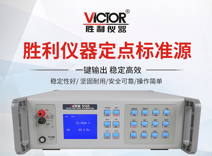 VICTOR 9105交直流電壓定點(diǎn)標(biāo)準(zhǔn)源,實現(xiàn)從1000V以內(nèi)的交流和直流電壓標(biāo)準(zhǔn)信號,用于定值激勵檢測的應(yīng)用。定點(diǎn)操作,一鍵輸出,迅速穩(wěn)定,適合生產(chǎn)線工位使用,操作簡單提高生產(chǎn)效率。