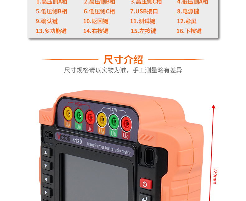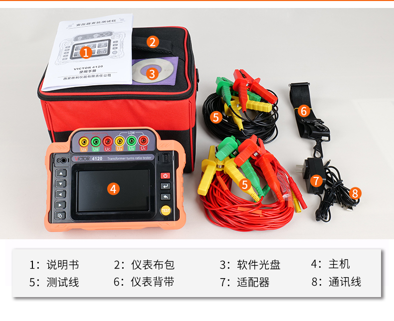 VICTOR 4120變壓器變比測試儀由主機、監控軟件、測試線、通訊線等組成。主機具有充電功能無需現場找電、全彩大屏LCD顯示,語種可選擇中文或英語,一目了然,觸屏操作方便易用,端口防過載功能,大容量存儲500組數據。上位機軟件具有歷史數據讀取、查閱、保存等功能。