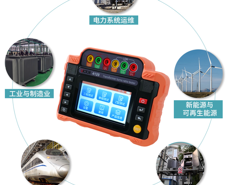 VICTOR 4120變壓器變比測試儀采用微處理機技術進行測量計算和自動化控制,可快速簡便的測量變壓器的實際變比和組別。主要用于電力行業測量變壓器變比和組別,同時用于變壓器廠家和經銷商測量變壓器各項參數。