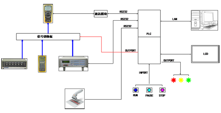 自動化測試系統(tǒng)是用于自動校準(zhǔn)、檢驗三位半或四位半數(shù)字萬用表的自動化裝置。系統(tǒng)分為:被檢萬用表、標(biāo)準(zhǔn)設(shè)備、PLC控制系統(tǒng)、計算機等部分組成。系統(tǒng)通過在PLC的控制下完成對檢測對象的機械聯(lián)動、電氣連接、通訊控制、信息顯示、數(shù)據(jù)采集和傳輸?shù)裙δ埽挥捎嬎銠C進行數(shù)據(jù)的收集和存儲。從而實現(xiàn)基本全自動化的校準(zhǔn)和檢驗工作。 可根據(jù)用戶需求定制,為用戶提供完美的自動測試解決方案。