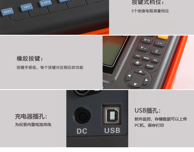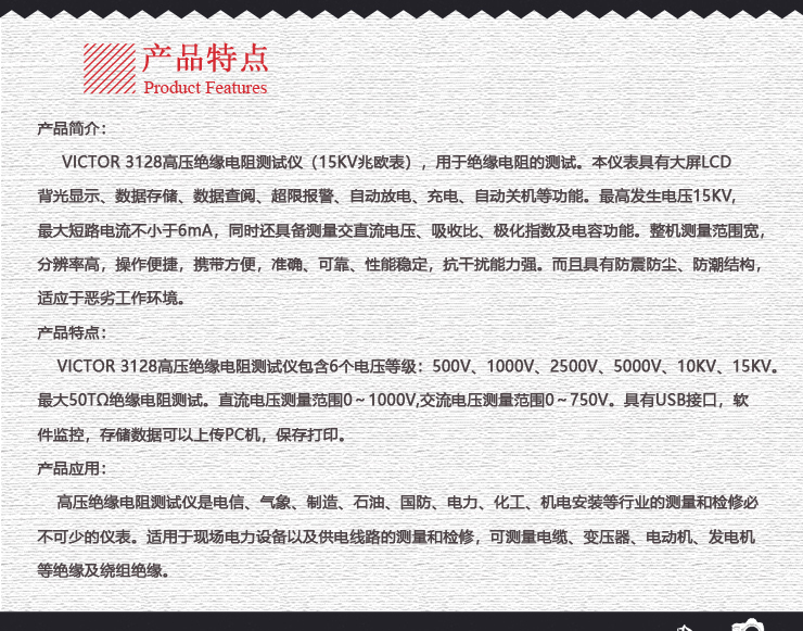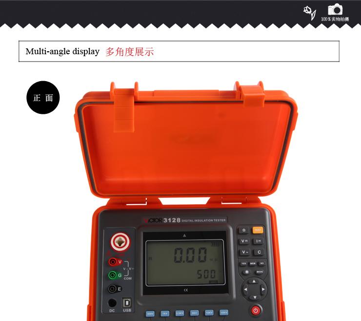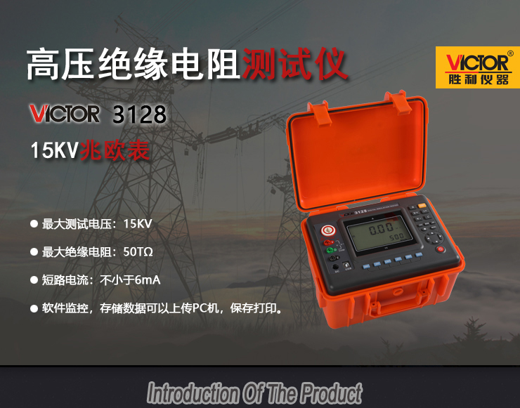 VICTOR 3128 高壓絕緣電阻測試儀包含6個電壓等級:500V、1000V、2500V、5000V、10KV、15KV。最大50TΩ絕緣電阻測試。直流電壓測量范圍0~1000V,交流電壓測量范圍0~750V。具有USB接口,軟件監控,存儲數據可以上傳PC機,保存打印。