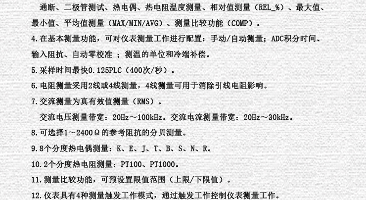1. 儀表有4-1/2位、5-1/2位、6-1/2位顯示分辨率,最高顯示讀數值±1200000字。