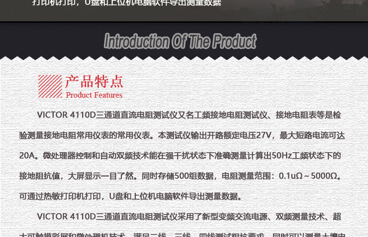VICTOR 4110D三通道直流電阻測試儀輸出開路額定電壓27V,最大短路電流可達20A。微處理器控制和自動雙頻技術能在強干擾狀態下準確測量計算出50Hz工頻狀態下的接地阻抗值,大屏顯示一目了然。同時存儲500組數據,電阻測量范圍:0.1uΩ~5000Ω。可通過熱敏打印機打印,U盤和上位機電腦軟件導出測量數據。