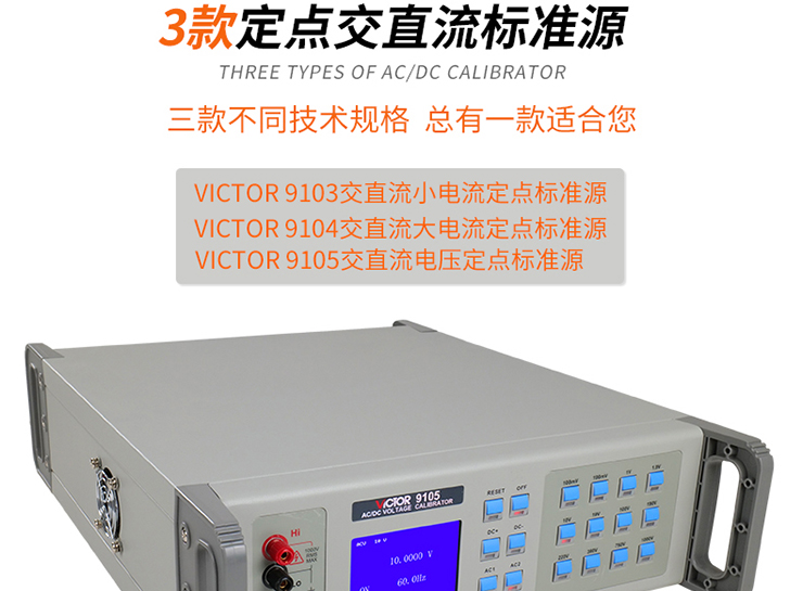 VICTOR 9105交直流電壓定點(diǎn)標(biāo)準(zhǔn)源,實現(xiàn)從1000V以內(nèi)的交流和直流電壓標(biāo)準(zhǔn)信號,用于定值激勵檢測的應(yīng)用。定點(diǎn)操作,一鍵輸出,迅速穩(wěn)定,適合生產(chǎn)線工位使用,操作簡單提高生產(chǎn)效率。