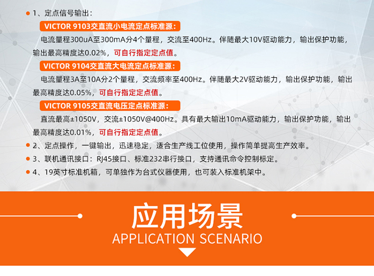 VICTOR 910x系列交直流電壓/電流標(biāo)準(zhǔn)源(以下簡稱標(biāo)準(zhǔn)源)是6位輸出值顯示,定點(diǎn)輸出交直流電壓/電流的標(biāo)準(zhǔn)源。采用數(shù)字式信號合成技術(shù)和先進(jìn)的穩(wěn)幅、功放、保護(hù)新技術(shù),使其穩(wěn)定性好、精度高、安全可靠。通過按鍵選擇,直接輸出一個固定值,輸出快速方便。具有以太網(wǎng)RJ45接口、標(biāo)準(zhǔn)RS232通訊接口,軟件協(xié)議簡單,便于組成系統(tǒng)。