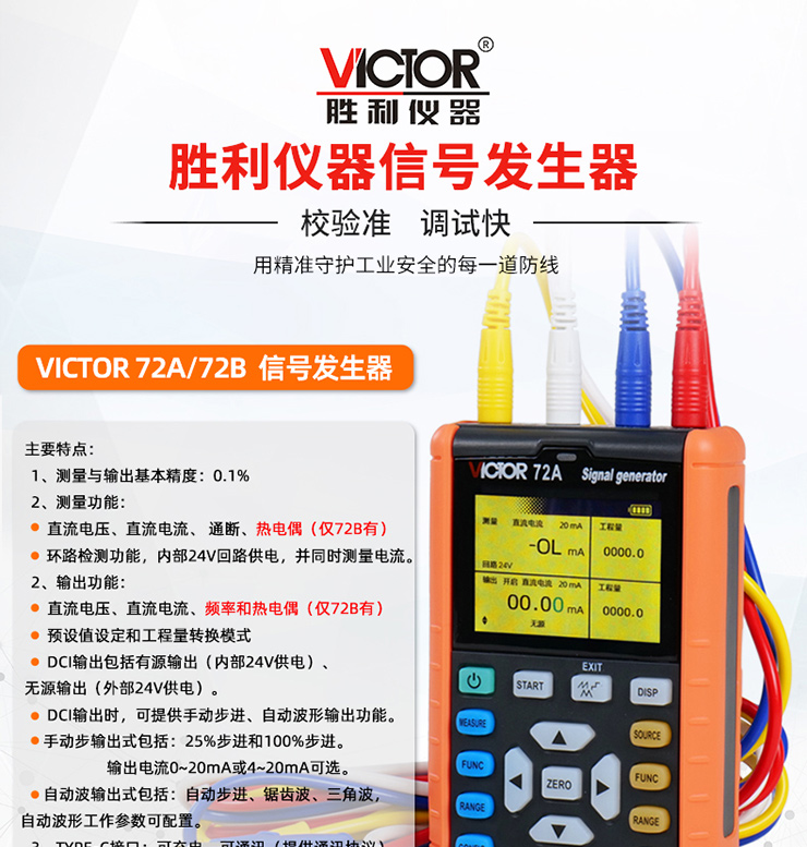 信號(hào)發(fā)生器,可用于測(cè)量直流電壓、直流電流、通斷,可模擬輸出直流電壓、直流電流、熱電偶、頻率。適用于現(xiàn)場(chǎng)變送器、DCS、PLC等系統(tǒng)的調(diào)試和校準(zhǔn)。VICTOR 72B在石油化工、生物制藥、工業(yè)自動(dòng)化、大專院校和科研機(jī)構(gòu)等領(lǐng)域的得到了廣泛的應(yīng)用,是工程師、技術(shù)工人及科研人員的“口袋級(jí)”實(shí)用工具。