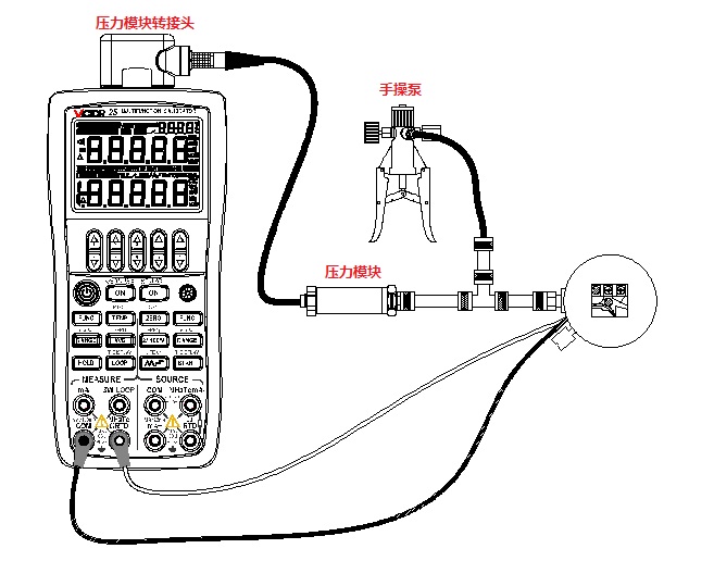 將VICTOR 25的輸入設(shè)置為提供回路電壓同時(shí)測(cè)量電流,輸出設(shè)置為壓力,通過(guò)改變外部壓力源的輸出壓力,便可對(duì)壓力變送器進(jìn)行校準(zhǔn)。