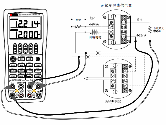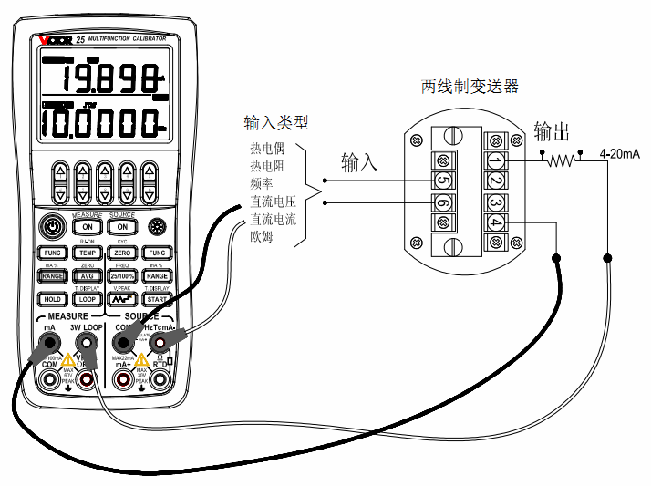 它的輸出端與供電電源共用兩根線,在此之間產生4~20mA的變化電流,并與輸入信號成比例。VICTOR 25所具有的同時輸出和測量并提供24V回路電源的功能,非常適合對各類的兩線制變送器進行校準。以頻率輸入的變送器為例,如上圖所示,VICTOR 25輸出設置為頻率,測量設置為mA,改變VICTOR 25的輸出頻率,輸入則會相應變化,以此便可校準這臺變送器。